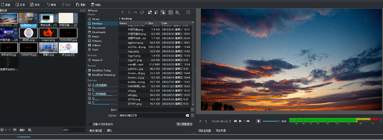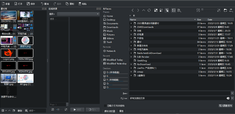 素材库、媒体浏览器、在线资源等功能可以添加文件、文件夹资源,创建媒体文件夹,速度浏览添加本地、外设、在线等支持的各种格式的媒体资源,更改素材视图模式调整素材预览大小、排序方式等。