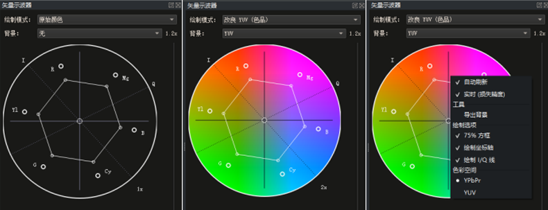 内置矢量示波器对图像颜色饱和度进行分析,根据损失精度、坐标轴、I/Q线、色彩空间,对绘制模型原始颜色YUV、黑、绿等参数进行调整,对背景YPbPr、YUV等参数调整。
