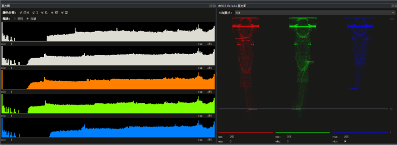 内置RGB Parade直方图对视频画面像素分布进行分析评估,可以选择颜色分量、线性、对数选择显示方便查看图像细节参数。